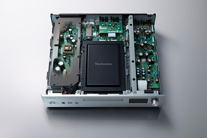 Generatore di clock a batteria.                                                                                                           Technics ha una vasta esperienza nell’isolare l’alimentatore usando una batteria. Questa tecnologia crea interfacce audio digitali a basso rumore tra cui convertitori D / A. Inoltre, l’orologio del sistema audio viene fornito da un generatore di clock a bassissimo jitter. Un alimentatore a basso rumore e un circuito di clock di alta qualità realizzano un suono con trasparenza.