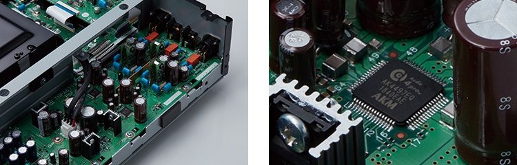 Per l’uscita audio analogica, il circuito D / A è uno dei blocchi di circuiti più importanti poiché ricrea la forma d’onda analogica originale da una sorgente digitale, come un CD. Per i convertitori D / A, il DAC AK4497 top-of-the-line dei dispositivi Asahi Kasei Micro, con il loro elevato rapporto S / N e la bassa distorsione, sono isolati per i canali sinistro e destro. L’alimentatore per i convertitori D / A è suddiviso in cinque sezioni in base all’applicazione e fornito singolarmente. L’alimentatore per l’orologio utilizza un sistema di circuiti a batteria originale per ottenere una conversione D / A ad alta precisione. La costruzione Dual Mono e il layout asimmetrico eliminano le interferenze reciproche tra i canali sinistro e destro, portando la riproduzione delle immagini sonore e dello spazio sonoro registrati nella sorgente a una dimensione superiore.